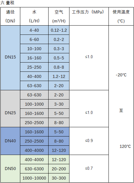 3.流量范围是由通径决定,和型号及连接方式等无关。