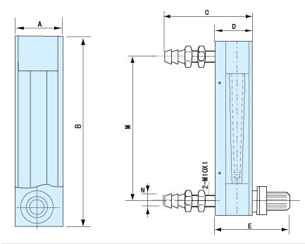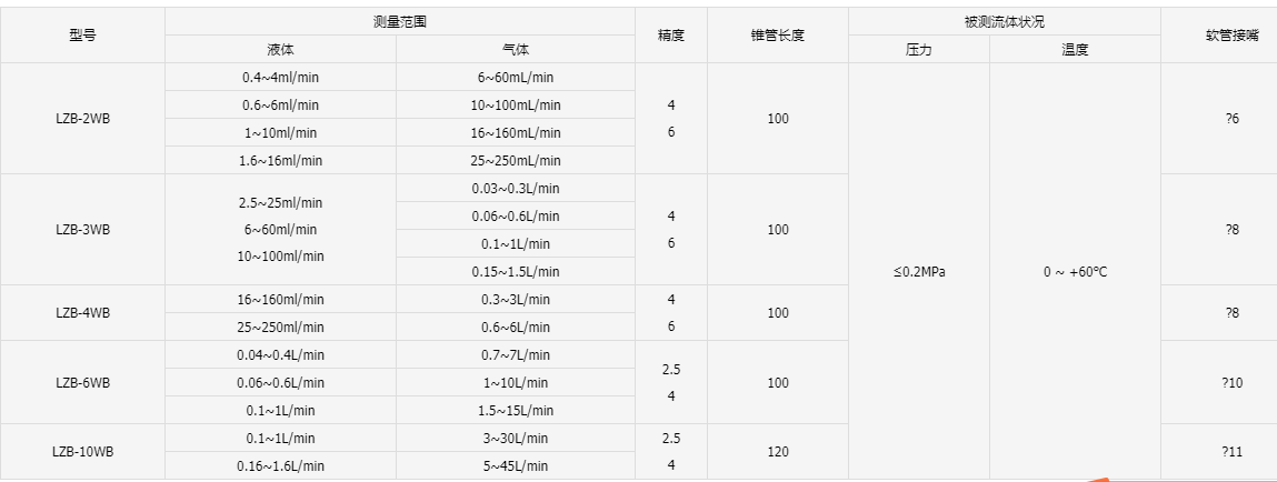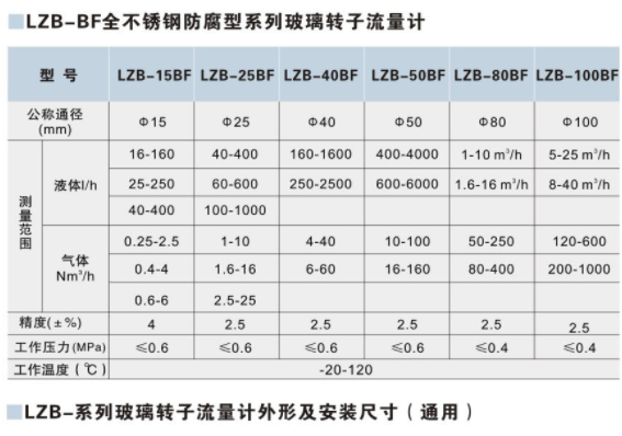 全不锈钢玻璃管浮子流量计主要由一根自下而上扩大的锥形玻管和一只随流体流量大小上下移动的不锈钢浮子组成(图3)。流体自下而上流经锥管时,流体动能在浮子上产生的升力S和流体的浮力A使浮子上升,当升力S与浮力A之和等于浮子自身重力G时,浮子处于平衡,稳定在某一高度位置上,锥管上的刻度指示流体的流量值。氩气玻璃转子流量计价格WB表示带调节阀,W表示不带调节阀,WBF表示带调节阀防腐型,WF表示不带调节阀防腐,流量计 中浮子读数位置按图2所示:GD -LZB/LZB-( )F 流量计 的锥管为光滑内壁管(见图4),通径DN15以上的流量计,浮子通过导杆 上下移动,保持稳定;GD -LZJ/LZJ-( )F流量计锥管 内壁有三条导向凸筋,使浮子保持稳定(见图4)。通径DN10以下的流量计采用软管连接,配有 针形流量调节阀;通径DN15以上流量计采用法兰连接。接触测量流体的零部件材质型号规格及技术参数LZB(WB)表示带调节阀,LZB(W)表示不带调节阀。全不锈钢型法兰、浮子、导杆、支承板及螺栓等均为不锈钢304(1Cr18Ni9Ti),型号为GD -LZB-( )B。接液材质如需选用316,则型号为GD -LZB-( )Bo,需定做。如需不锈钢内衬PTFE,则型号为GD -LZB-( )BF(或BoF),需定做。全四氟型基座、浮子、针阀采用聚四氟乙烯(PTTFE)。支承板、螺丝等采用不锈钢LZB-( )WB、W型流量计可以检测气体或液体的小流量,具有小巧的外形,广泛用于各种分析仪器、环境保护设备、医疗设备及其它试验仪器配套。WB型带有调节阀、W型为不带调节阀结构。