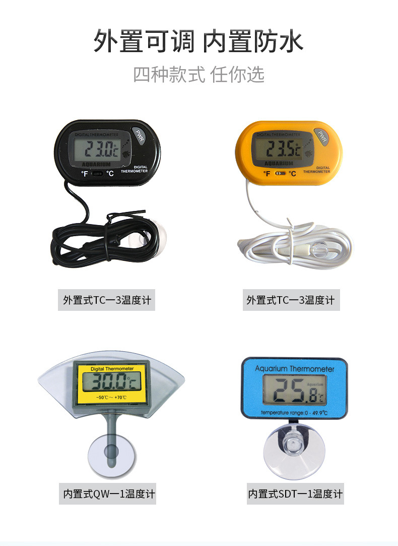 外观时尚小巧,特别防水设计,超强吸盘,可吸附于水族箱内,测温准确,方便。主要数值加大显示,观察更清晰。
