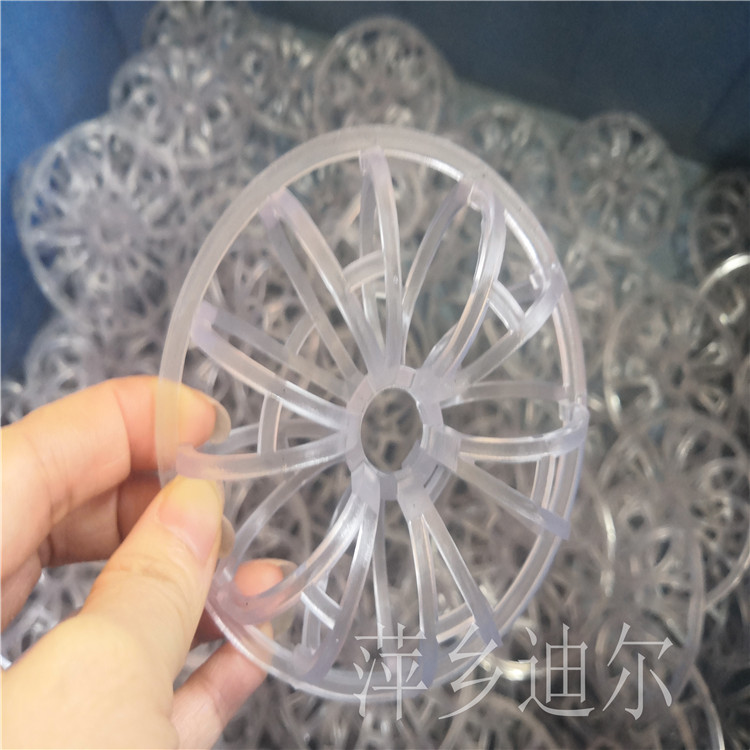 江西省萍乡市迪尔化工填料有限公司生产的PVC花环DN95梅花环又称泰勒花环,是由12个小圆环按径向排列而组成的一个大扁环体,很类似于一个螺旋形弹簧首尾相接绕成的一个圆球体。