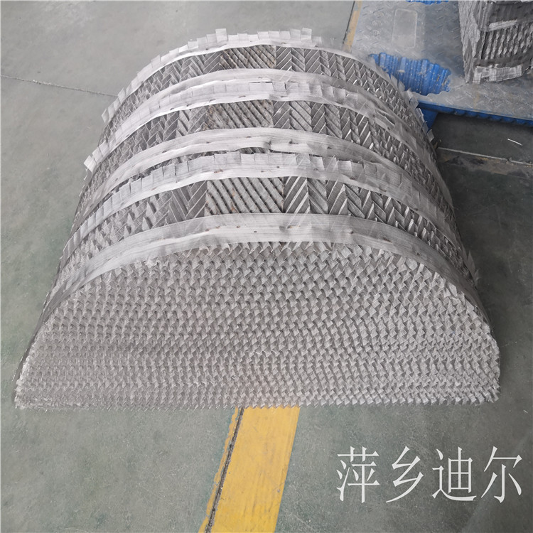江西省萍乡市迪尔化工填料有限公司生产的丝网波纹填料是填料由压成波纹的丝网片排列而成,波纹片倾角30度或者45度;相邻两波纹片方向相反,在塔内填装时,上下两盘填料交错90度叠放。具有效率高、压降低和通量大的优点,产品有BX、CY型,常用于难分离和热敏性物质的真空精馏,常压精馏和吸收过程;
