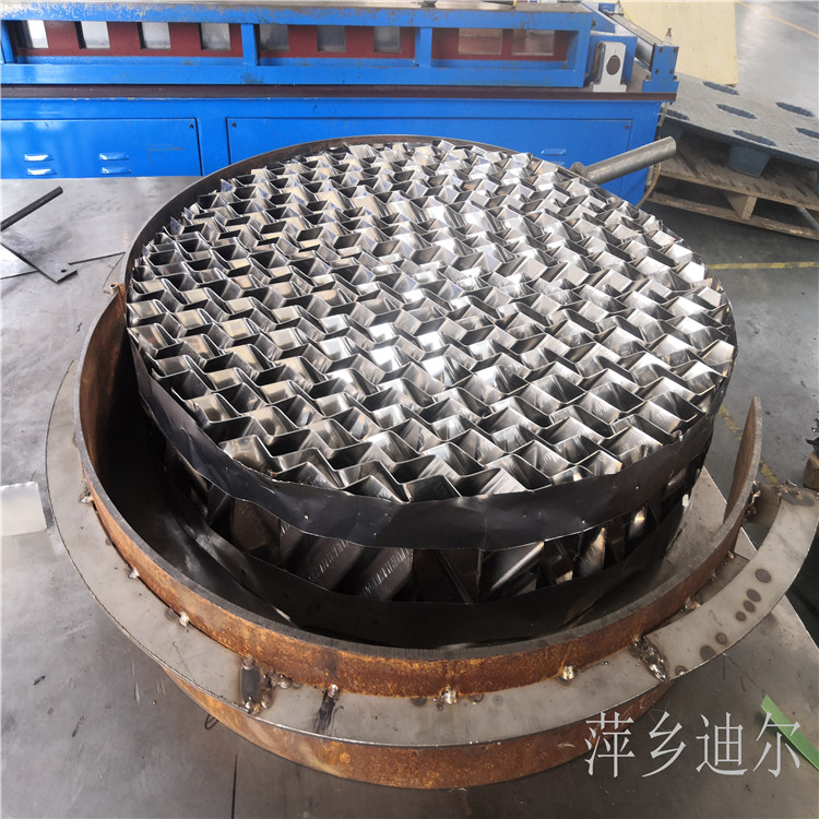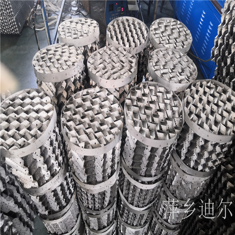波纹填料是一种通用型规整填料,目前工业上应用的规整填料绝大部分属于此类。波纹填料是由许多波纹薄板组合成的圆盘状填料,结构紧凑,排列规则,其比表面积可逝过波纹结构的形状进行调整;波纹与塔轴的倾角主要有30°和45°两种,各盘填料垂直装于塔内,组装时相邻两波纹板反向叠靠,相邻的两盘填料间交错90°排列,这种相互垂直的排列方式使上升气流不断改变方向,下降的液体也不断重新分布,流体在塔内充分混合,故传质效率高。