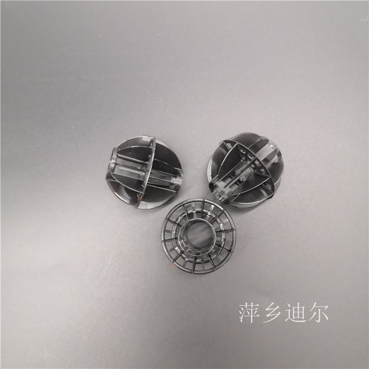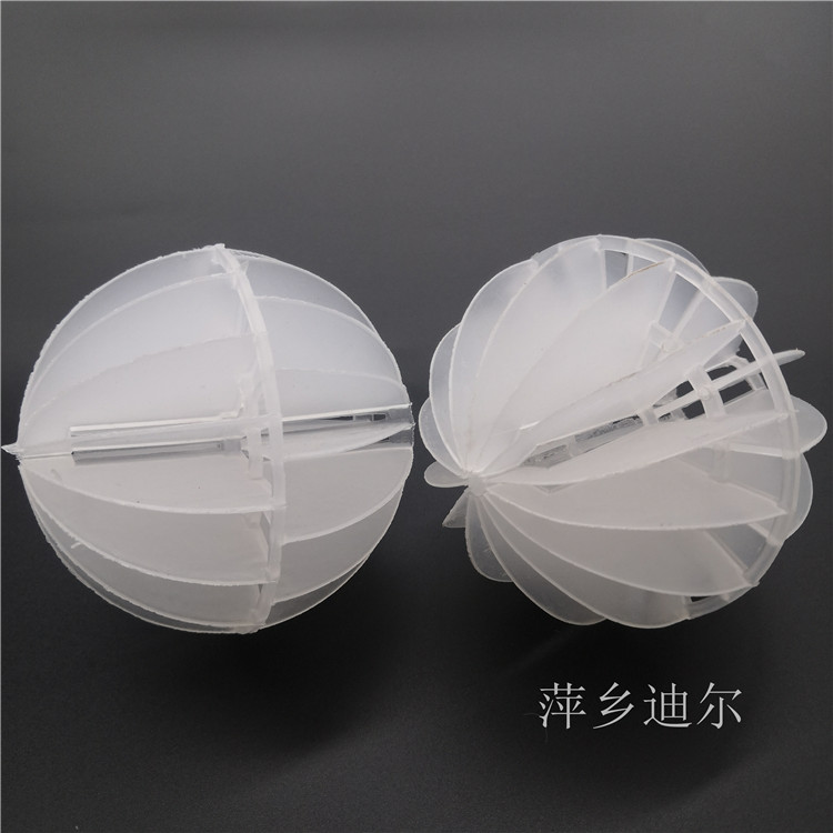 江西省萍乡市迪尔化工填料有限公司生产的多面空心球是由塑料制成球状,由两个半球合成一个球形,每个半球上开有12个半扇形叶片,两个半球的扇形叶片相互错开。多面空心球填料特点是比表面积大,空隙率较高。但是由于叶片数偏多,彼此间有遮蔽效应,不利于液体分布和润湿;液体大多在球体空心柱聚集,阻碍气体畅通,因此阻力较大。此种填料多用于水处理工程。原油减压蒸馏,高真空蒸馏,烯径分离,异构体分离,萃取蒸馏等。