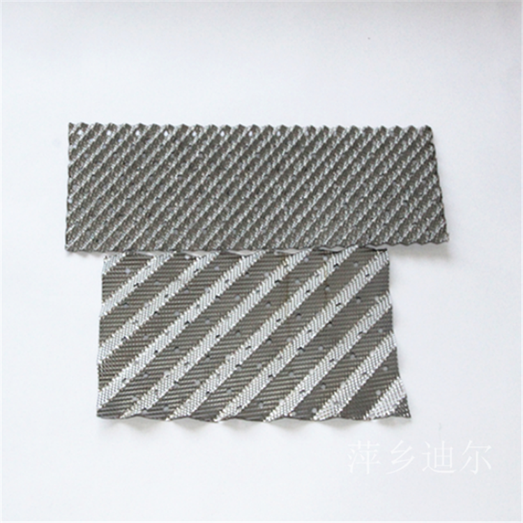 江西省萍乡市迪尔化工填料有限公司生产的250Y金属孔板波纹填料是由若干波纹平行且垂直排列的金属波纹片组成,波纹片上开有小孔,波纹顶角约900度,波纹形成的通道与垂直方向成45度或30度角度。相邻两波纹片流道成90度,上下两盘波纹填料旋转90度叠放,在直径较小用法兰连接的塔内,波纹填料做成一个个整的圆盘,直径略小于塔的内径。在直径较大的塔内,每盘波纹填料分成数块,通过人孔放入塔内,在塔内拉拼成一个个完整的圆盘,上下两盘填料的波纹片旋转90度安装,使流体在塔内充分混合。