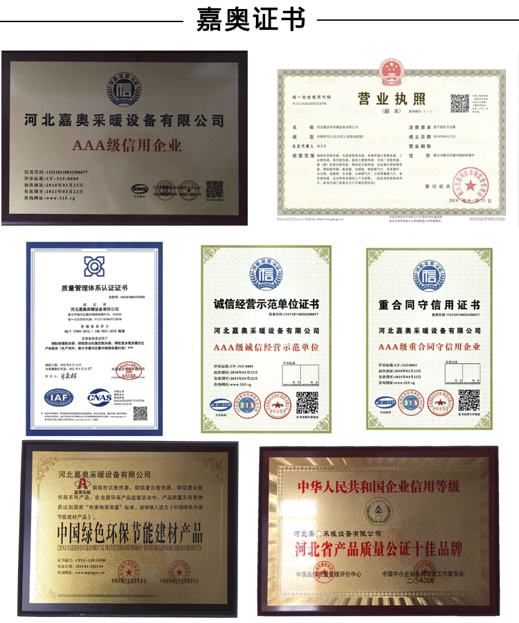 钢六柱暖气片是蒸汽供暖系统专用产品,适用于高温高压。蒸汽暖气片选择钢制六柱暖气片,材质:嘉奥进口的优质低碳钢(进口原材料)工艺:焊接采用先进的内部焊接工艺,焊接强度高,承压能力强,使暖气片的焊接口不受外部腐蚀,耐压耐温,承压能力能达到26公斤。独特的表面抛丸及酸洗磷化处理;超细纳米防腐涂料,真空灌装防腐涂层均匀无限防腐;进口抗紫外线全聚酯塑粉,全自动静电喷塑附着力更强,表面光洁亮丽;外表采用先进的静电喷塑,烘干等工艺处理,色彩艳丽,经久耐用,清洁方便。