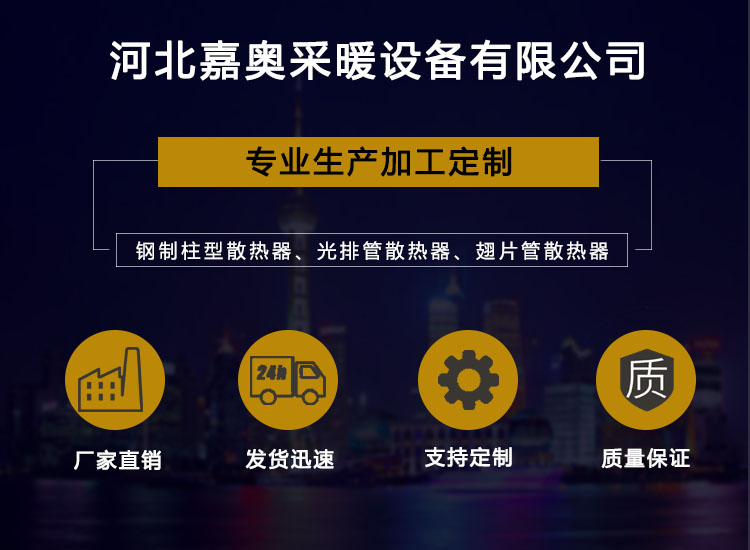 本公司凭着多年的生产经验,已在采暖领域取得了丰硕成果,成为国内暖气片品牌。公司主要生产:铜铝复合散热器、钢铝复合散热器、钢制柱型散热器、钢制弧管柱型散热器、压铸铝散热器、新型铸铁散热器、卫浴散热器、钢制板式散热器、钢制翅片管对流散热器、工业光排管散热器、工业车间专用翅片管散热器、温室大棚养殖畜牧业专用翅片管等百余种系列产品,赢得了广大用户的信赖和好评。