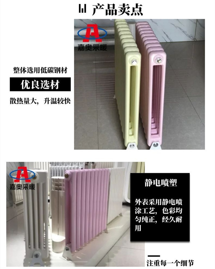 钢管柱型暖气片容水量大,散热效果好。内腔采用内防腐材料精心处理,防腐性能优异,使用寿命长。外表采用静电喷塑和烘干工艺,色彩艳丽、造型高贵典雅、装饰性强。适用:广泛适用于集中供热、独立供热、蒸汽等各种采暖系统,常用于厂房、办公楼、住宅等散热量需求大的场所。
