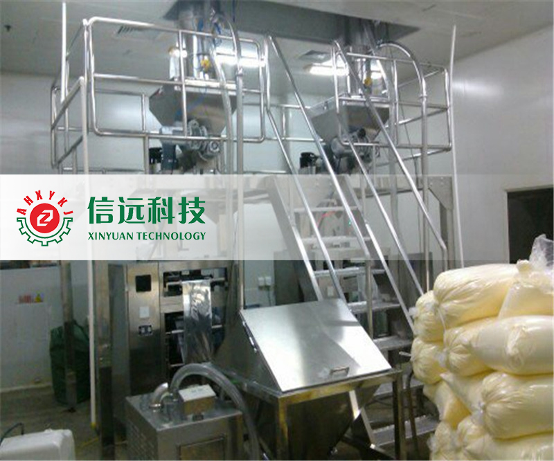 原料—→投料开袋站—→脉冲除尘系统—→自动配料系统—→静态称重系统—→正压上料系统—→脉冲除尘系统—→混合系统—→包装系统—→成品输送。