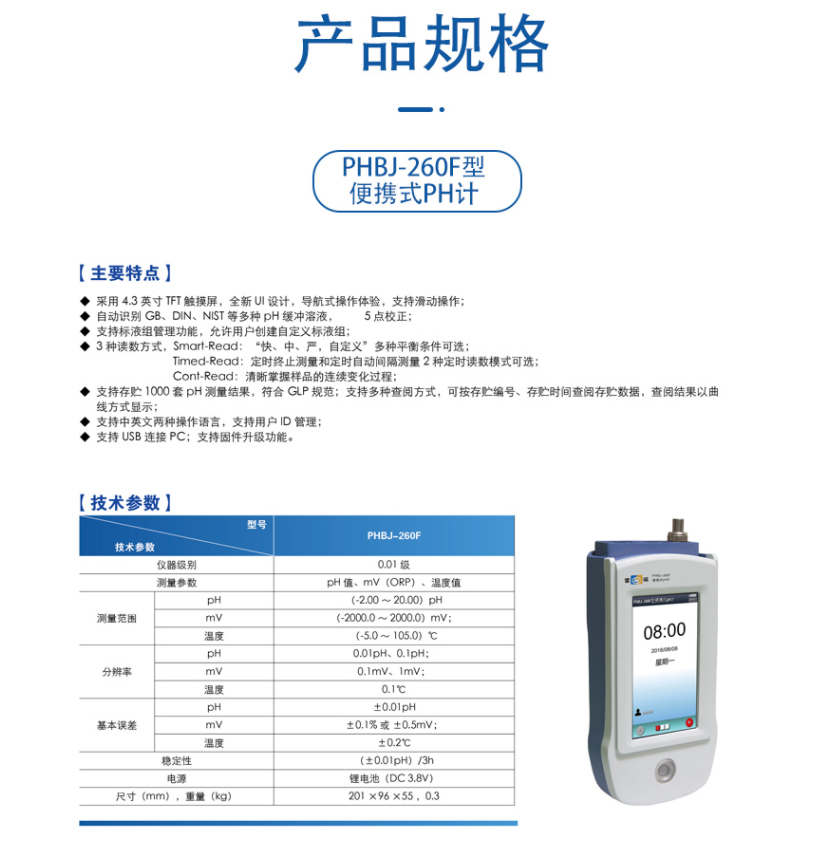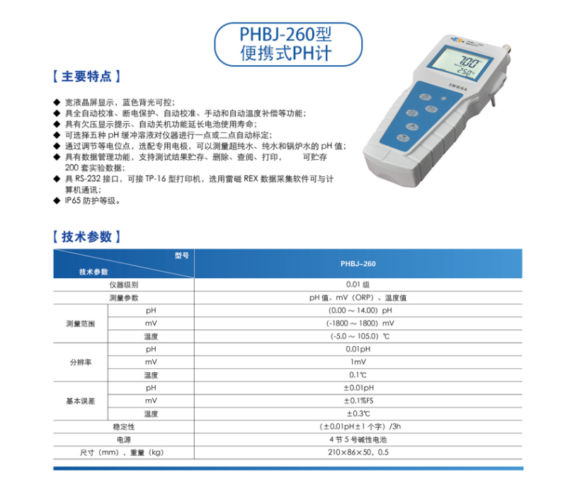 2.自动识别3种标准缓冲溶液(4.00pH、6.86pH、9.18pH)