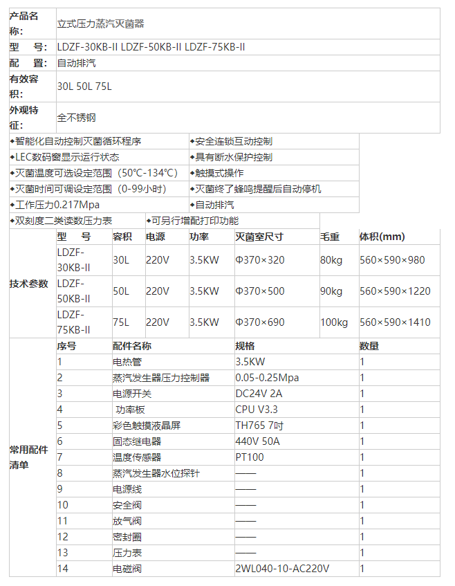 LDZF-KB-II系列立式压力蒸汽灭菌器技术参数: