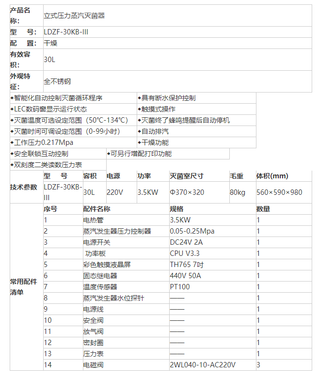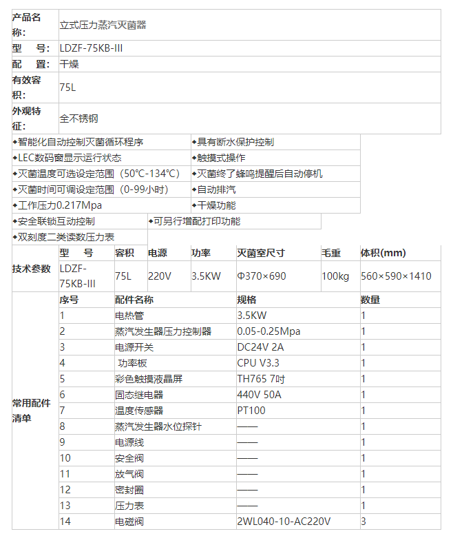 LDZF-KB-III系列立式压力蒸汽灭菌器技术参数: