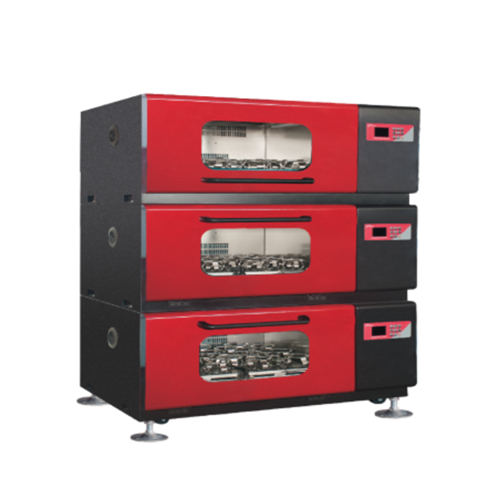 *2、下两层为下翻式开门,第三层为上翻式开门,摇板可自由抽出,方便装卸摇瓶,每层可独立控制,各层可在不同温度转速下同时运转或根据需要运转任意一层。