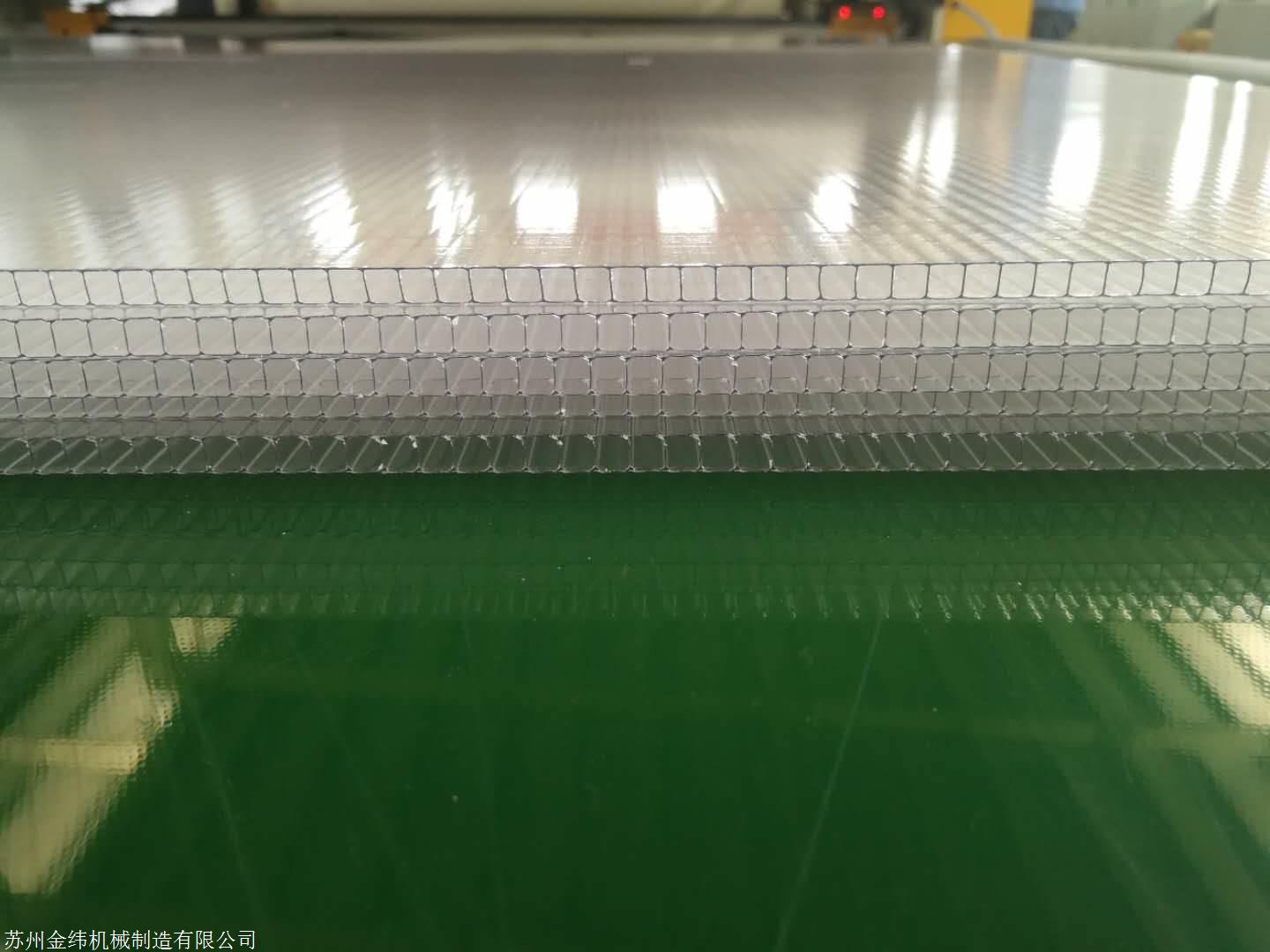 本机组由单螺杆挤出机,齿轮泵+液压换网,中空板模头,真空定型台,,,牵引机,烘箱,电晕处理,冷却台,二,牵引,切边,和定长切割,卸料台等组成。