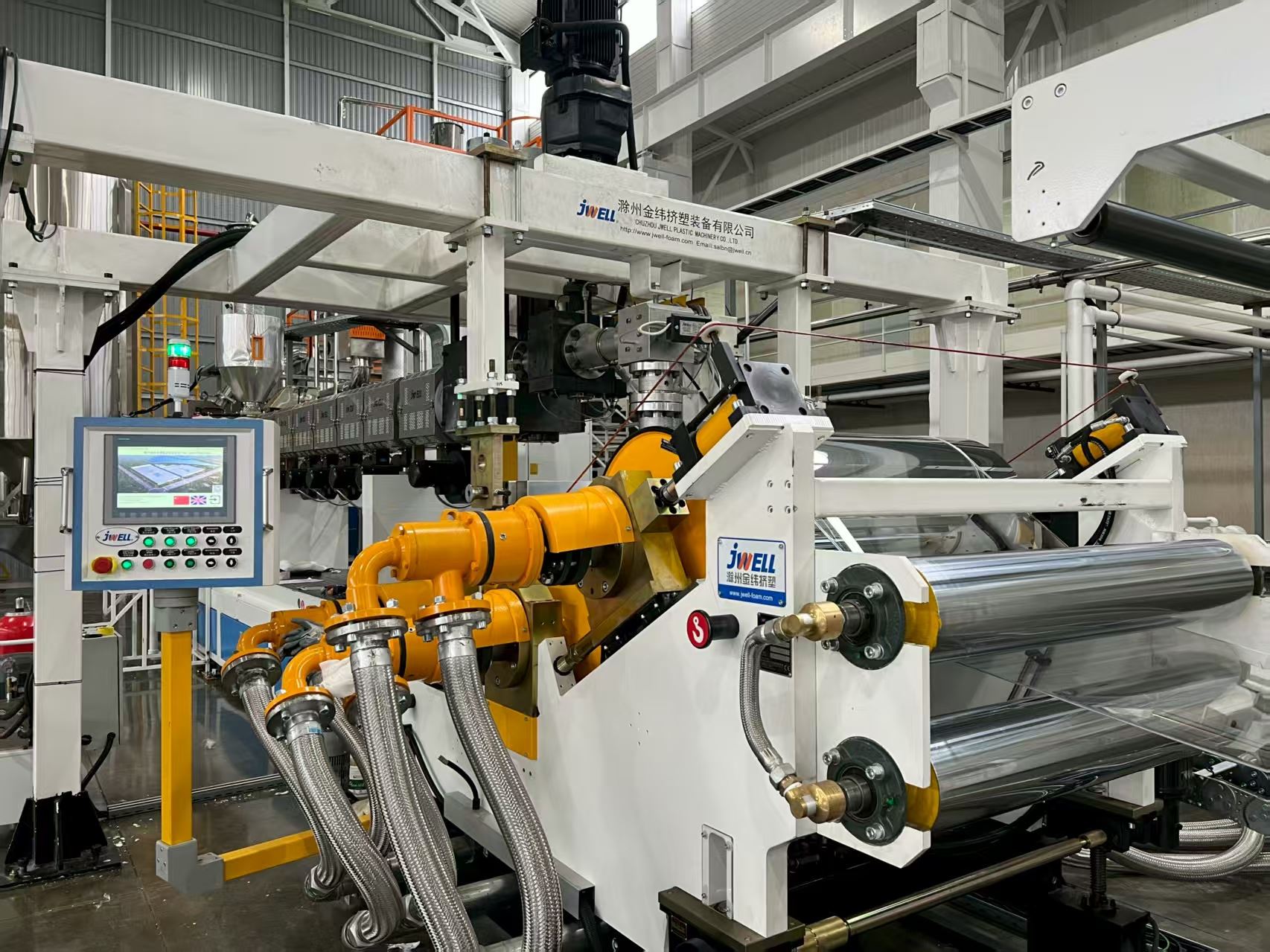 PP片材生产线,PS片材生产线,PVC片材生产线,PC片材生产线,PMMA片材生产线,GPPS片材生产线,PET片材生产线,PP淀粉片材生产线,PLA片材生产线,EVA片材生产线,EVOH片材生产线,PP中空格子板生产线,PC中空格子板生产线,中空成型机,PP蜂窝板生产线,PVC医用软袋膜生产线,EVA医用软袋膜生产线,PP板材生产线,PE板材生产线,PVDF板材生产线,ABS板材生产线,PVC板材生产线,TPU薄膜生产线,TPU片材生产线,TPU车衣膜生产线,TPU流延膜生产线,TPUABS模内复合板材生产线,PE土工膜生产线,PVC防水卷材生产线,TPO防水卷材生产线,涂布头,螺杆,模具,辊筒,夹缝涂布头,挤出机