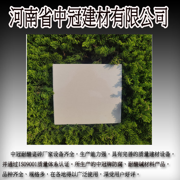 中冠建材有限公司以石英、长石、粘土为主要原料,经窑炉高温烧制而成的耐火防腐材料。中冠厂家生产的耐酸砖分为素面与釉面两种;素面的具有超强的防滑能力。釉面的表面光滑,易清洗。只是面上不同,质量上是**相同的都是高质量的耐火耐酸防腐材料。中冠耐酸砖具有耐酸碱度高、耐温度高、吸水率低、在常温下不易**,不易被介质污染等性能对于温氯盐水、**、、**等酸类及在常温下的任何浓度的碱类,均有优良的抗腐作用。里面含有二**硅70%以上,在化学工业中多应用于砌酸沟、酸井、贮酸库及载酸大的受冲击地面。中冠全瓷耐酸砖在石油、化工、冶金、电力、化纤、造纸、制药、化肥、食品、乳业、果汁、电镀室以及塔、池、罐、槽等防腐工程企业被广泛应用。并在地下污水道和露天地面等工作都可发挥其耐腐蚀力。中冠全瓷耐酸砖的个性性能均达*****标准,甚至于超越*****标准。