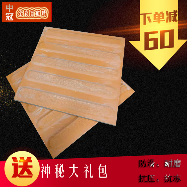 【中冠全瓷盲道砖】由三类砖铺就,一类是条形方向引路砖,引导盲人放心前行,称为行进盲道砖,或盲道方向引路砖;一类是带有圆点的提示砖,提示盲人前面有障碍,该转弯了,称为提示盲道砖,或盲道方位引路砖;后一类就是盲道危险***引路砖,圆点较大的,就是警视不要***,前面危险。