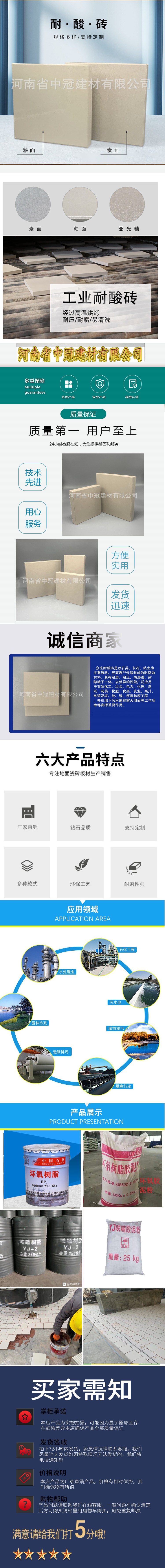 ,我公司出产的耐酸瓷砖采用真空挤压成型的加工模式,在抗冻、抗压、抗冲击、耐磨、防潮、防腐、防滑等诸多方面都**于半干压法成型的防腐耐酸砖。我公司在耐酸砖背面添加了更易与粘接材料贴合的燕尾槽,在施工时可与耐酸胶泥更加紧密的贴合,不易脱落。这一设计,既保证了施工质量,又能延长砖体的使用寿命,是化工、化纤、化肥、石油、冶炼、食品、等工业行业理想的防腐材料。