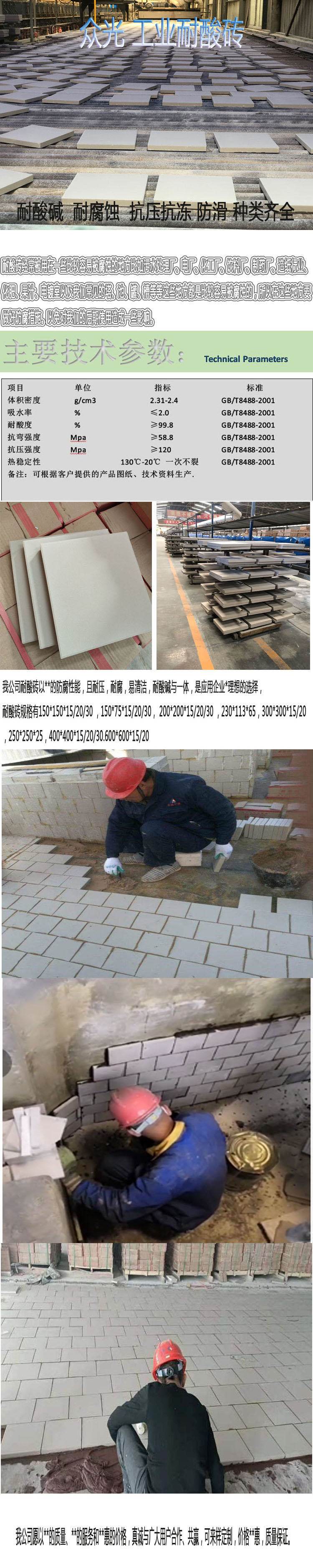 焦作众光耐酸砖的原料都是经过精挑细选的*质原材料,这些原材料在高温作用下能释放出耐强酸强碱的二氧化硅,这是它被称为耐酸砖和耐碱砖的根本原因。耐酸瓷砖在生产过程中采用的真空挤压成型技术,改变了普通瓷砖体积密度小,容易渗透的缺点,在液体的抗渗透方面性能*越,接触到砖体的酸碱性液体几乎不会渗入到砖体内部,这也从另一个侧面保证了耐酸砖对酸碱成分的超强耐受性。