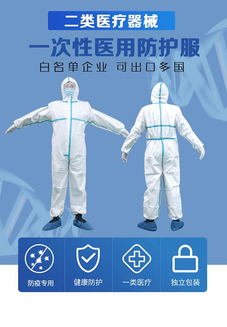 防护服是通过缝制和粘合无纺布制成的。本产品用于阻挡和保护临床医务人员在工作中接触的潜在传染性患者的血液、体液和分泌物。