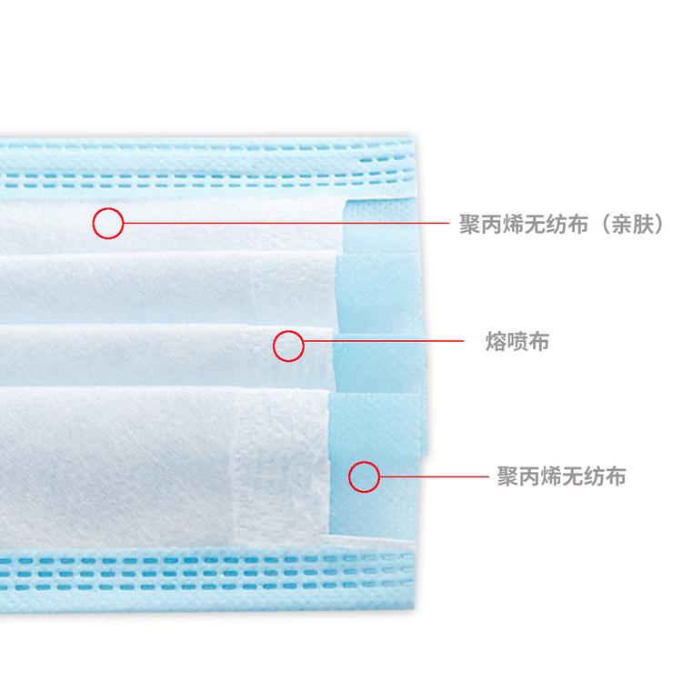 主要结构组成或者成分:由表层、中间层、底层、口罩带、鼻夹组成。表层材料为聚丙烯纺粘布、中间层材料为聚丙烯喷丝法制成的过滤熔喷布、底层材料为聚丙烯纺粘布,口罩带为涤纶线和少量氨纶线针织而成、鼻夹为可弯折可定型的聚丙烯制成。