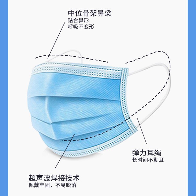 【主要结构组成或者成分】由表层、中间层、底层、口罩带、鼻夹组成。表层材料为聚丙烯纺粘布、中间层材料为聚丙烯喷丝法制成的过滤熔喷布、底层材料为聚丙烯纺粘布、口罩带为涤纶线和少量氨纶线针织而成、鼻夹为可弯折可定型的聚丙烯制成。