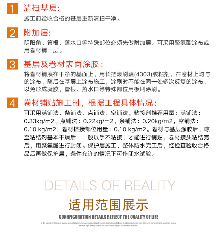 2、拉伸强度高、延伸率大,对基层伸缩或开裂的适用性强;