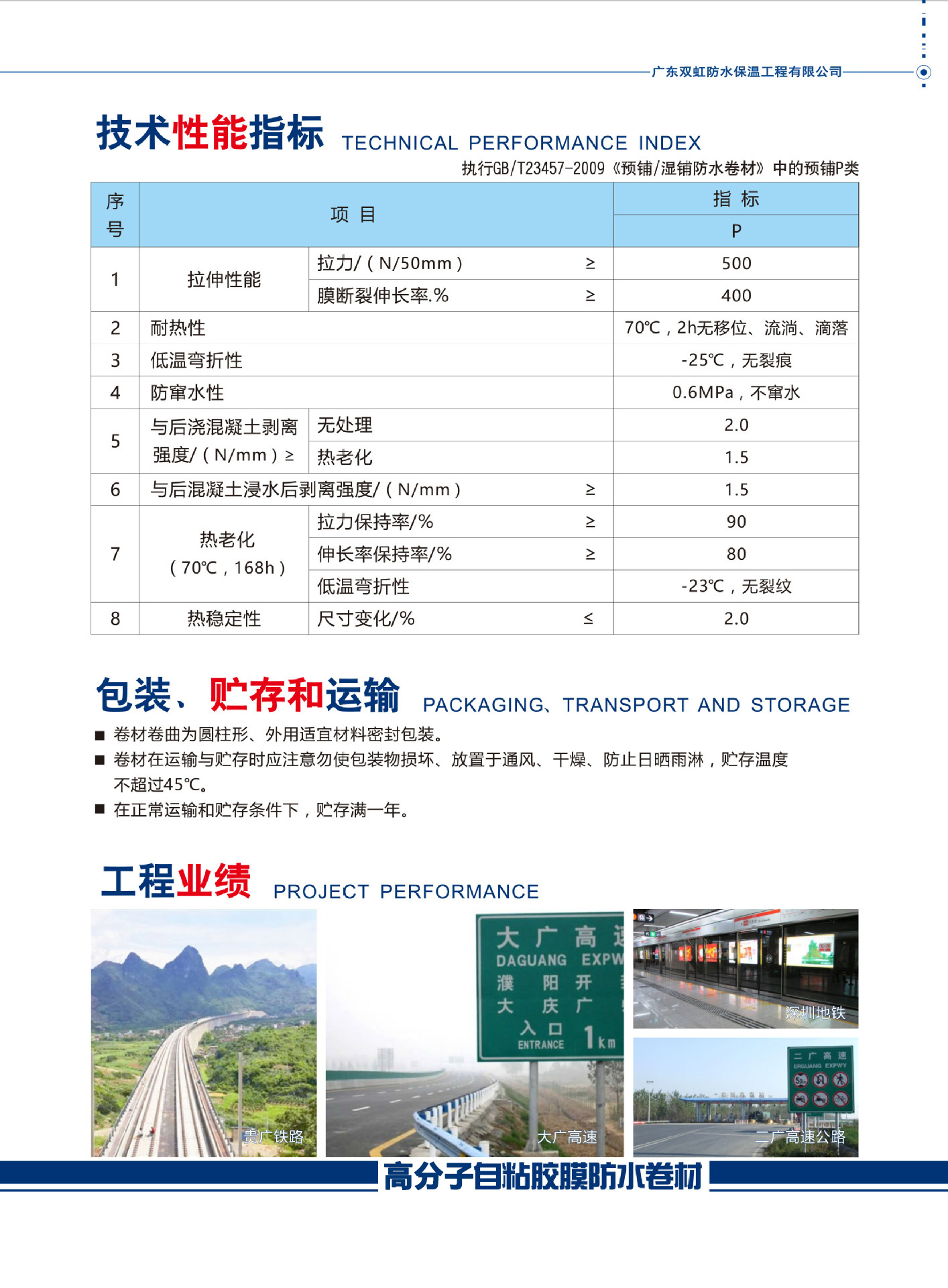 高分子自粘胶膜(非沥青基)防水卷材可与浇注的混凝土通过化学交联及物理卯榫,达到高强度、性的粘结,可以完全防止“窜水”,不受基层位移的影响,在长期浸水环境中也能保持很高的剥离强度。施工方便,简单处理即可加放浇注骨架钢筋