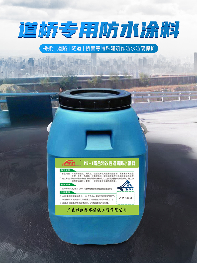 PB-1聚合物改性沥青防水涂料 以多种高分子聚合物对改沥青进行改性,高分子聚合物在改性沥青中形成连续网络聚合物,聚合物和沥青互相贯穿,交联,使产品呈现出高聚物的性能,具有良好的弹性和低温柔性,抗剪切力和抗老化力。能够经受道路和桥面长期负荷的要求,有效防止因渗水造成结构破坏,钢筋腐蚀,混凝土风化,有效解决解决高寒地区道路冻融问题。延长道路和桥梁的使用寿命.。