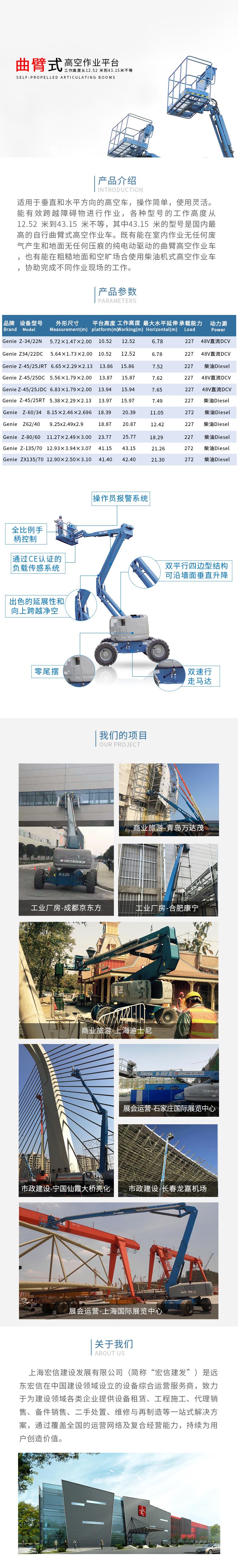 上海宏信设备工程有限公司有产品覆4-58米高空车,产品有直臂车、曲臂车、剪刀车、蜘蛛车、桅杆车等,提供国际知名品牌工程机械设备管理与施工服务,如美国JLG、吉尼、鼎力、德国TEUPEN和日本AIRMAN。产品全系列、多规格、大机队,高空车设备保有量跃居全国。高空车操作移动方便、经济安全。