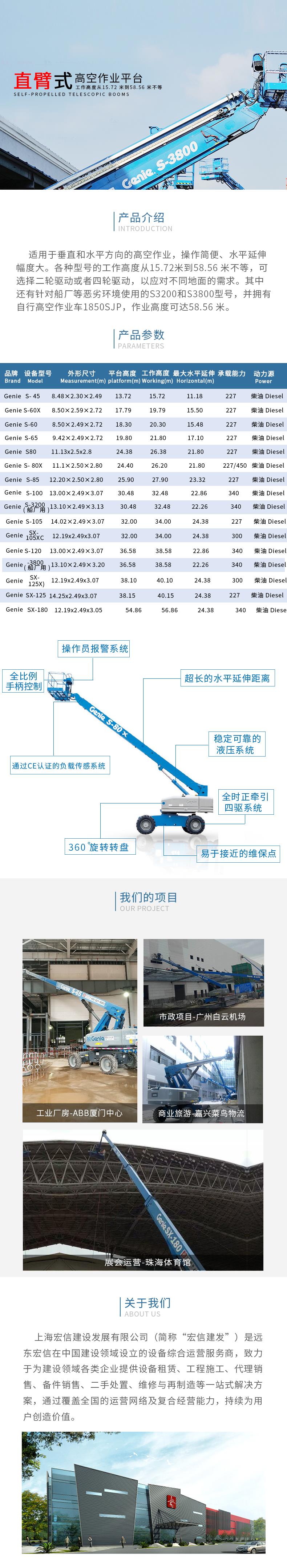 上海宏信设备工程有限公司有产品覆4-58米高空车,产品有直臂车、曲臂车、剪刀车、蜘蛛车、桅杆车等,提供国际知名品牌工程机械设备管理与施工服务,如美国JLG、吉尼、鼎力、德国TEUPEN和日本AIRMAN。产品全系列、多规格、大机队,高空车设备保有量跃居全国。8年来,我们建立营业网点多达82家, 资产规模突破30亿,业务遍布全国。我们致力于为客户提供一站式高空作业解决方案,让您的工程更安全、高效、经济。