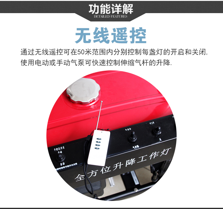 ◆ 使用电动或手动气泵快速控制伸缩气缸的升降,通过无线遥控可在30米的范围内,分别控制灯的开启和关闭的开放。