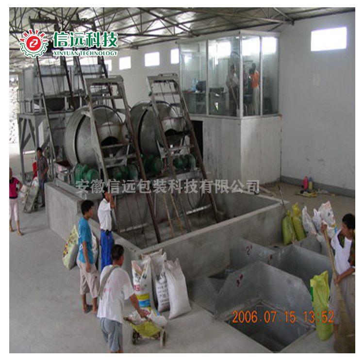 功能:将混合好的肥料自动提升至包装机料仓,包装秤按照设定的重量将物料充填入包装袋,经输送机送往缝包机工位,自动缝包,完成定量包装过程。设备配置:料仓及其支承架1组、检修平台1组、DCS-50KW型定量包装秤1台、托辊式胶带输送机1台、自动缝包装置1台。