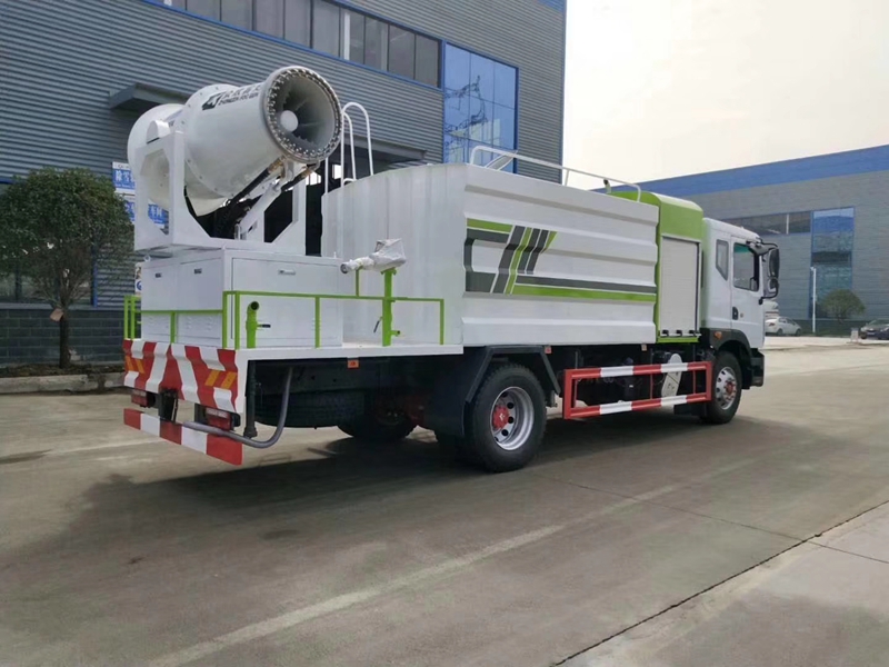 洒水车带雾炮是一种通过高压泵将喷雾喷洒到空气中,来吸附各种大小灰尘颗粒, 从而对粉尘、雾霾等恶劣污染环境,进行有效控制的新型专用汽车。相比于常规降尘设备,它具有良好的机动性、高效性,适用范围更广,工作效率也更高。