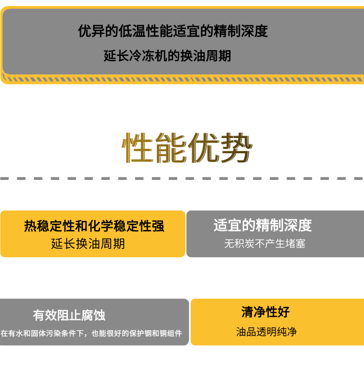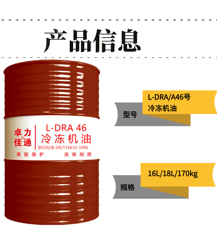 优异的低温性能:严格的倾点及U型管流动性指标可以确保油品不会在冷冻机的低温部件如蒸发器等处凝结,满足冷冻机从高温工作区到低温工作区的自由转换需求。优良的氧化安定性: DRA系列冷冻机油匹配了适量的抗氧添加剂,具有更好的抗。氧化性,从而有效的延长冷冻机的换油期。适宜的精制深度:确保油品不会在阀门等高温部位产生积碳,发生管道堵塞现象。清净性好: 油品透明纯净,对工作部件有清洁作用,可有效防止杂质颗粒摩擦轴承表面现象的发生。