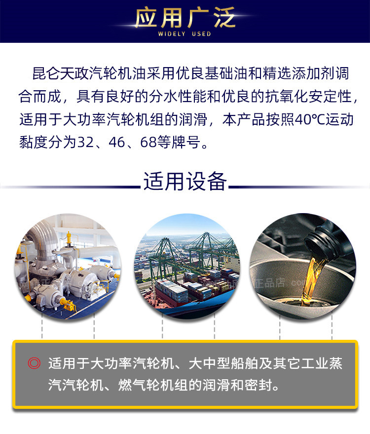 汽轮机油主要用于润滑汽轮发电机组和水轮发电机组的滑动轴承、减速齿轮与调速器以及用作液压系统的工作介质。此外汽轮机油还广泛用于大、中型船舶、的汽轮机、工业燃气轮机以及涡轮压缩机、涡轮冷冻机、涡轮鼓风机、涡轮增压器、涡轮泵等的润滑。