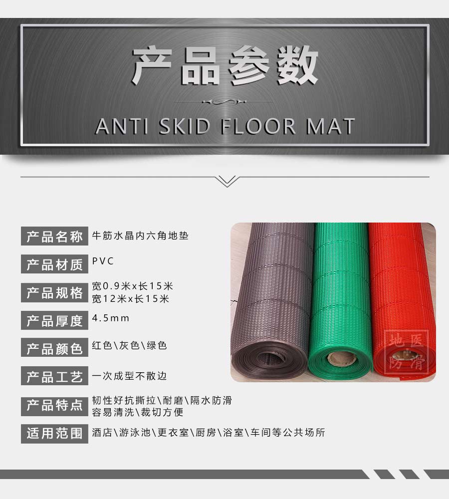 品牌:地医防护,卫生间防滑垫采用优质材料制成,经专业团队设计生产操作,确保每一道工序都经过严格把关,生产出的防滑垫具有较好的防滑效果,耐磨耐用、抗踩踏不变形、使用长久、柔韧性强、撕拉不断裂、任意折叠裁剪不散边不卷边、颜色齐全、可任意定制尺寸及图案满足客户的各种需求,防滑垫可适用于各种场所:卫生间、餐厅、酒店大厅、走廊、楼梯、淋浴间、游泳池、家用门口、宴席大厅、场地活动、室外活动、 店铺门口、洗手间地面、卧室门口、厨房地面、阳台、等场所。
