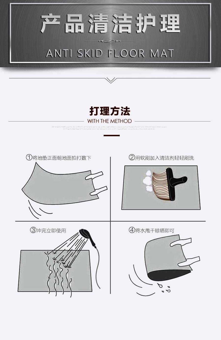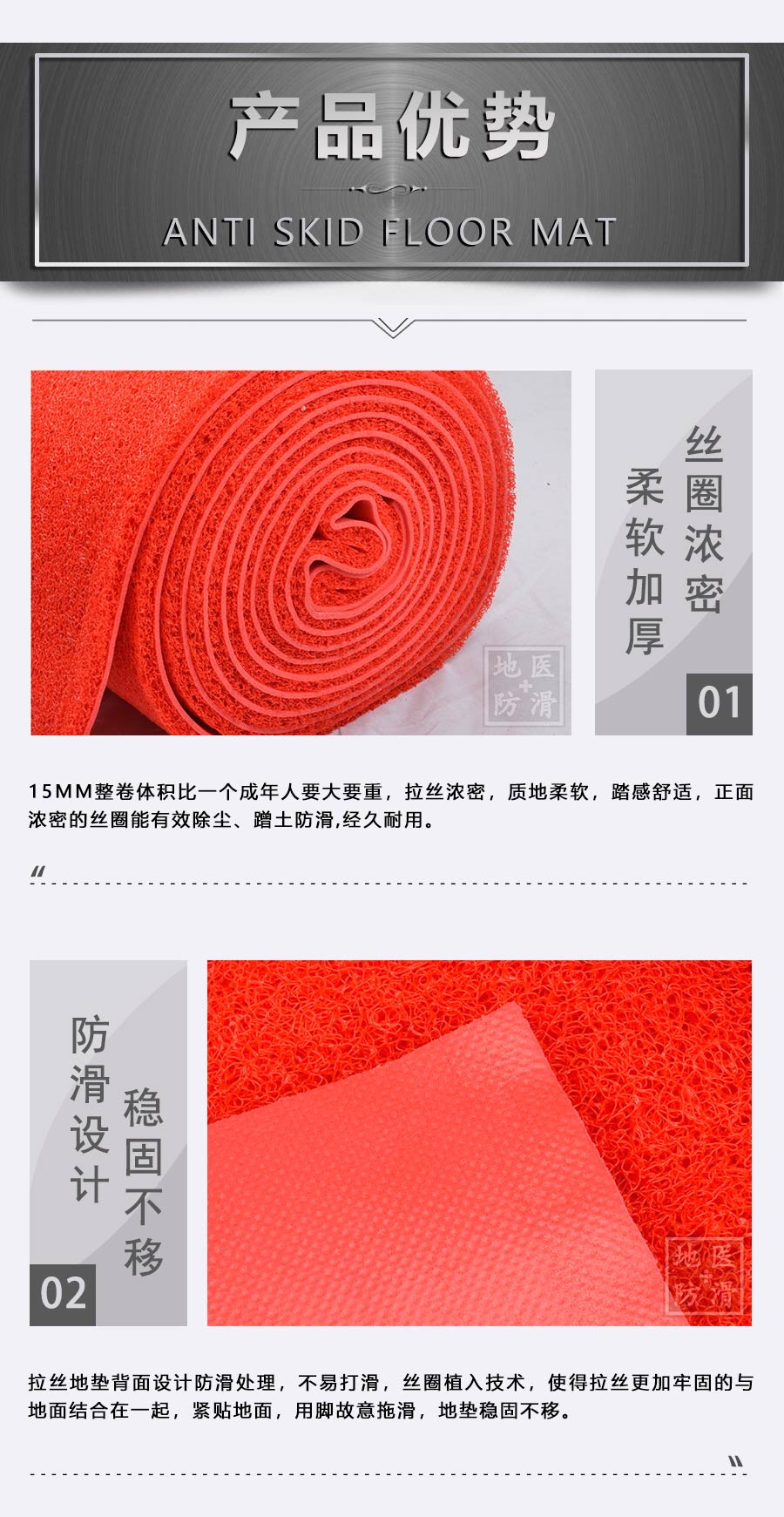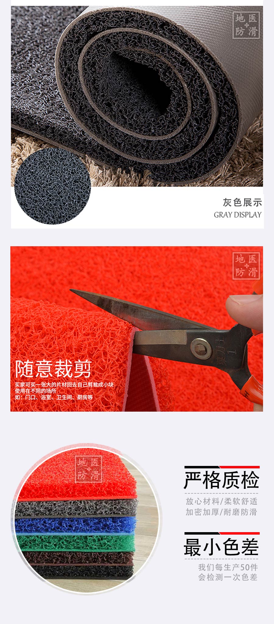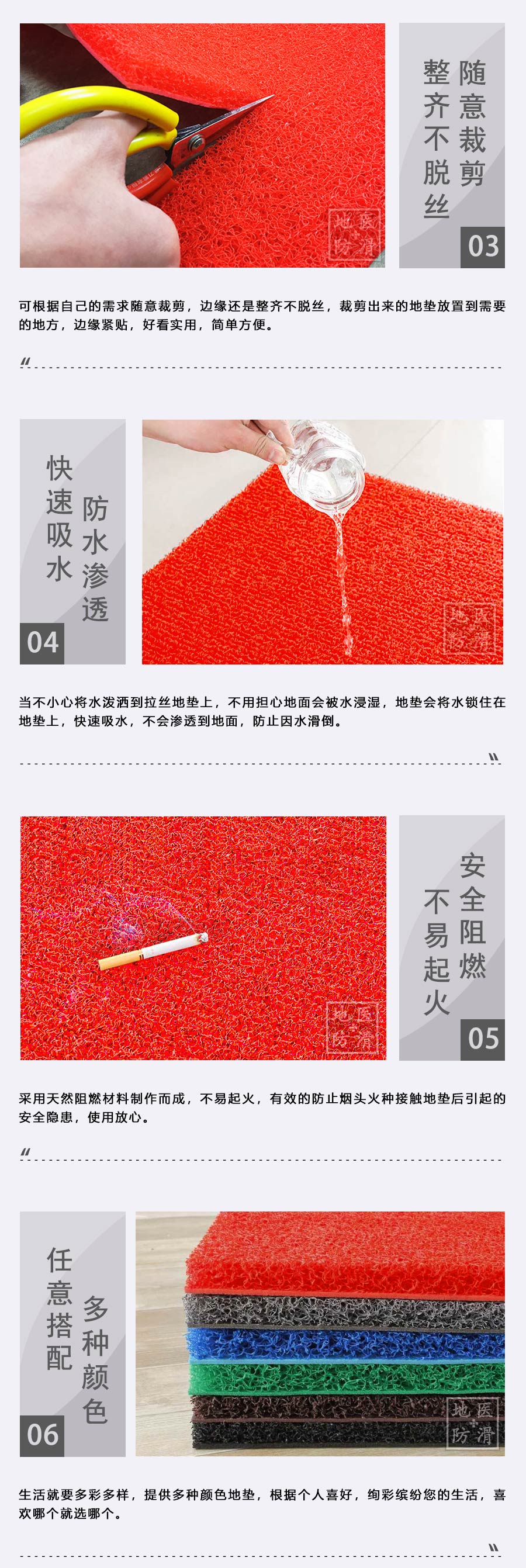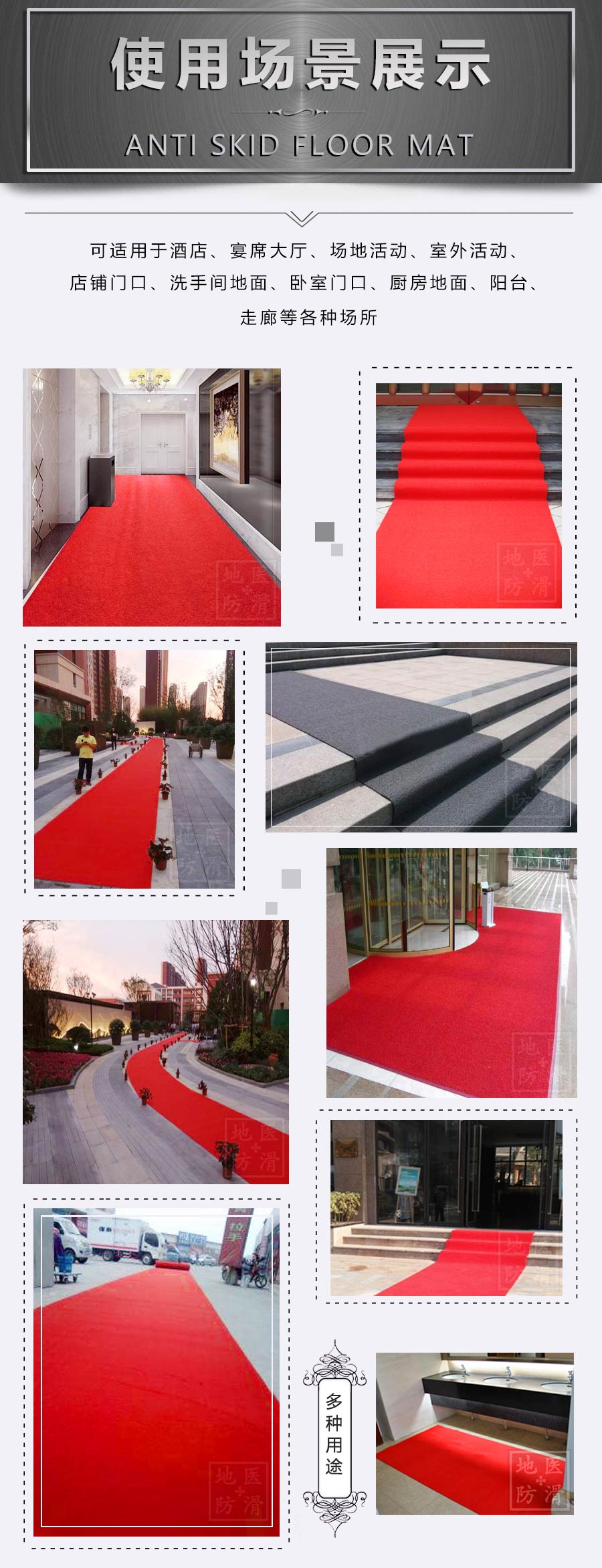 品牌:地医防护,酒店防滑垫采用优质材料制成,经专业团队设计生产操作,确保每一道工序都经过严格把关,生产出的防滑垫具有较好的防滑效果,耐磨耐用、抗踩踏不变形、使用长久、柔韧性强、撕拉不断裂、任意折叠裁剪不散边不卷边、颜色齐全、可任意定制尺寸及图案满足客户的各种需求,防滑垫可适用于各种场所:卫生间、餐厅、酒店大厅、走廊、楼梯、淋浴间、游泳池、家用门口、宴席大厅、场地活动、室外活动、 店铺门口、洗手间地面、卧室门口、厨房地面、阳台、等场所。