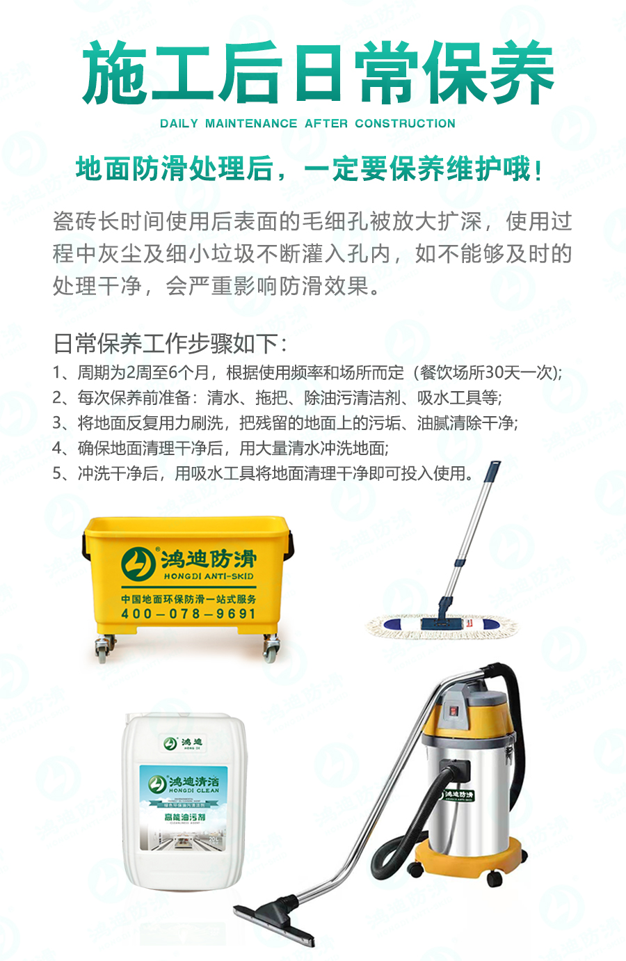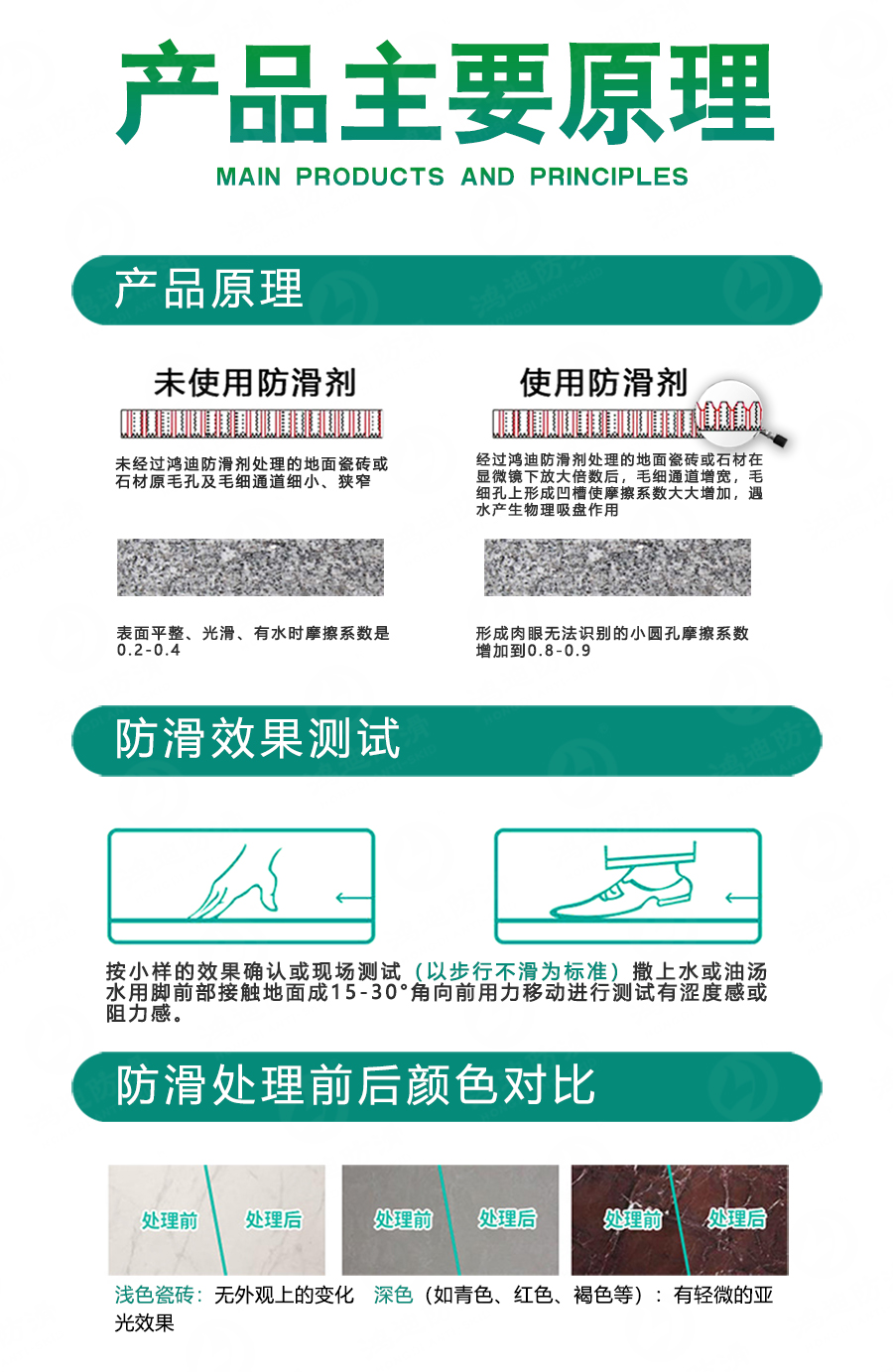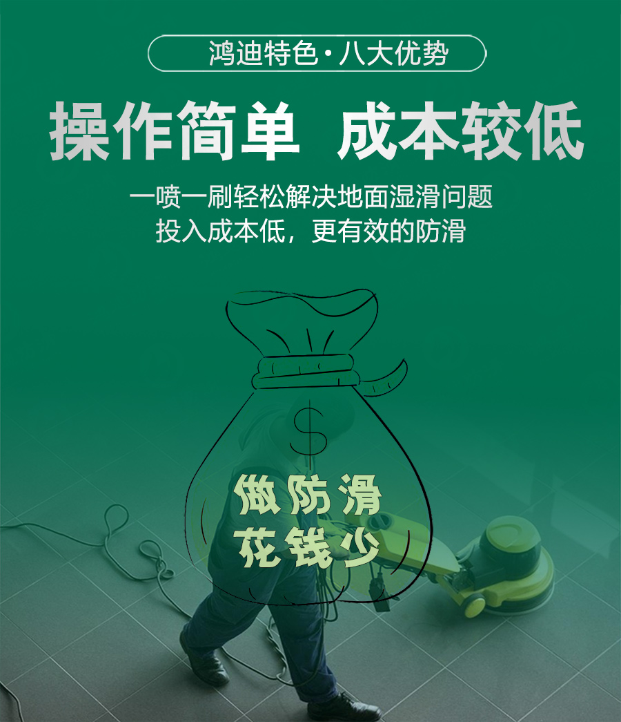 品牌:鸿迪防护,地面防滑材料是采用德国纳米技术,使用防滑剂后能够在地砖表面潮湿时有效增加摩擦系数,防止滑倒,经防滑处理后的地面瓷砖或地面石材磨擦系数大大增加。干燥时,可起到防滑作用,遇水后防滑效果呈倍数提高。防滑剂适用于各医院、敬老院、学校、办公楼、银行、酒店、游泳池、健身场所、商场、超市、步行街、机场、车站、火车站、地铁站等各种亲水型地砖的防滑处理。