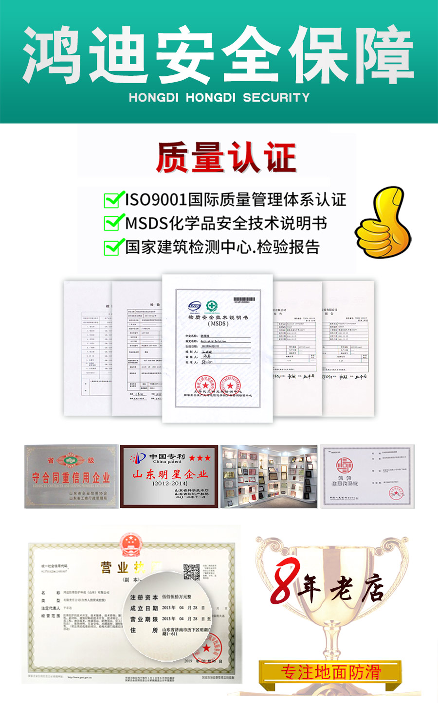 山东鸿迪防护公司生产的地面防滑材料以及其他防滑剂产品均通过严格的相关部门检测,如果您对公司地面防滑材料的参数与价格情况感兴趣,我们待您的询价咨询!