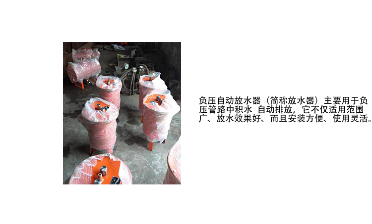 1、结合本矿井下的实际情况,放水器单台使用时,能正常于距地面高度大于0.45m的负压管道放水;还能用于对平铺于地面或埋设在地面下的负压管道的自动放水;放水器表面用红漆刷制以避免井下气体对放水装置的腐蚀。
