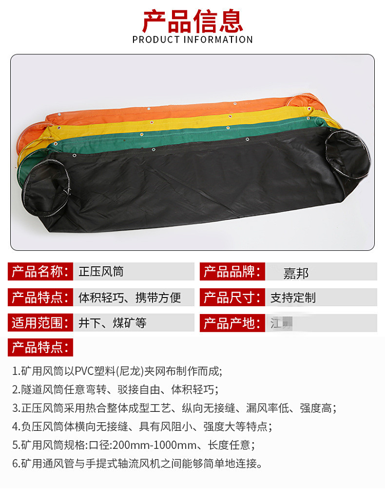 采用的是热合一次成型的工艺,纵向没有接缝,是煤矿和隧道常用的一款导风筒,主要的特点有:抗静电,阻燃,风阻小,漏风小,强度高等优点