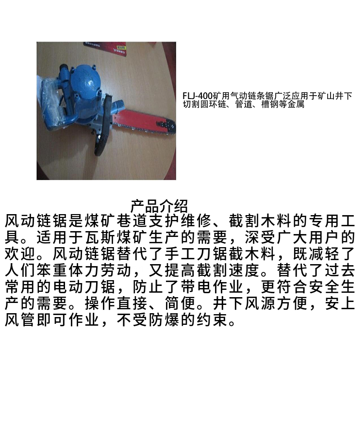 风动链锯是煤矿巷道支护维修、截割木料的专用工具。适用于瓦斯煤矿生产的需要,深受广大用户的欢迎。风动链锯替代了手工刀锯截木料,既减轻了人们笨重体力劳动,又提高截割速度。替代了过去常用的电动刀锯,防止了带电作业,更符合安全生产的需要。操作直接、简便。井下风源方便,安上风管即可作业,不受防爆的约束。
