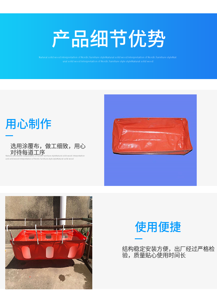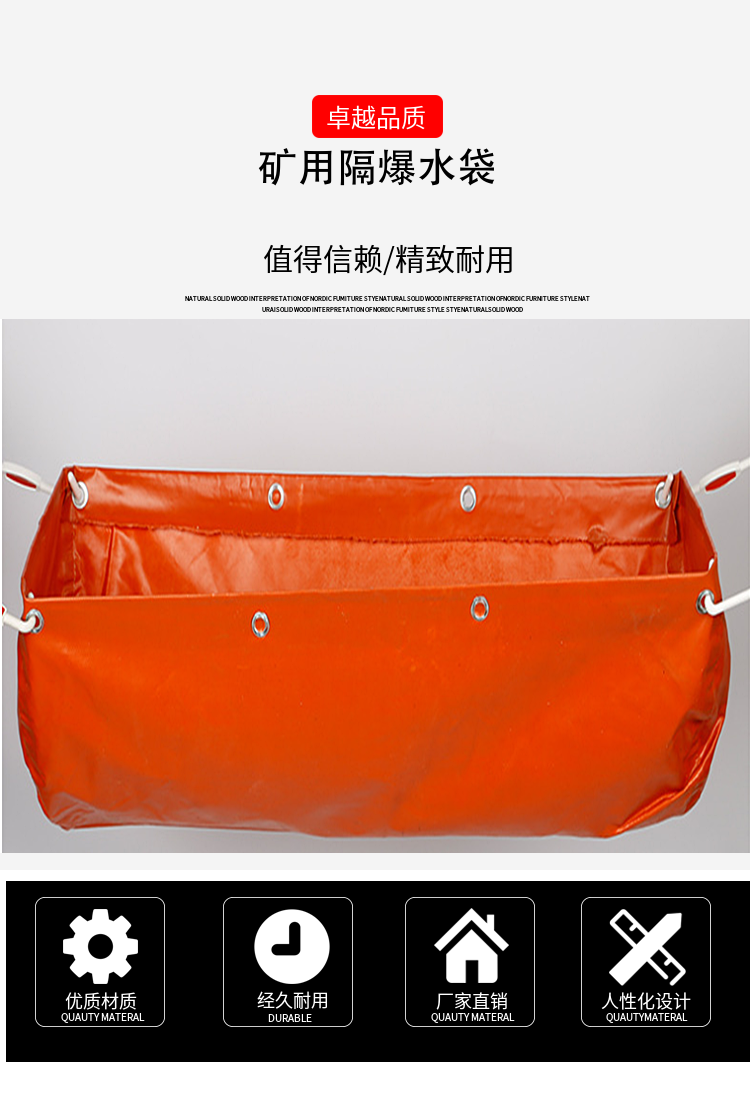 用于煤矿井下的安装容器,按安装技术要求组成的水袋棚能有效地隔绝瓦斯、煤尘的传播;制作水袋的材料具有阻燃、防静电等安全性能。水袋在运输过程中,防止机械撞击和摩擦,避免日晒、雨淋。