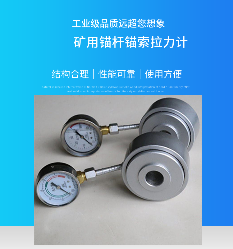 锚杆锚索测力计(锚杆液压枕)是测定锚杆受力变化的仪器,它对工程中常见的各类锚杆锚索均可使用.通过对锚杆锚索工况的检测,以便对巷道支护质量进行监控,因而也对巷道、峒室、围岩应力(应力显现)进行监控,是研究巷道、峒室之稳定性不可缺少的监测仪器.主要用于煤矿井下金属锚杆、锚索轴向涨拉力的检测,其涨拉力值可直接由压力表指针指示出。