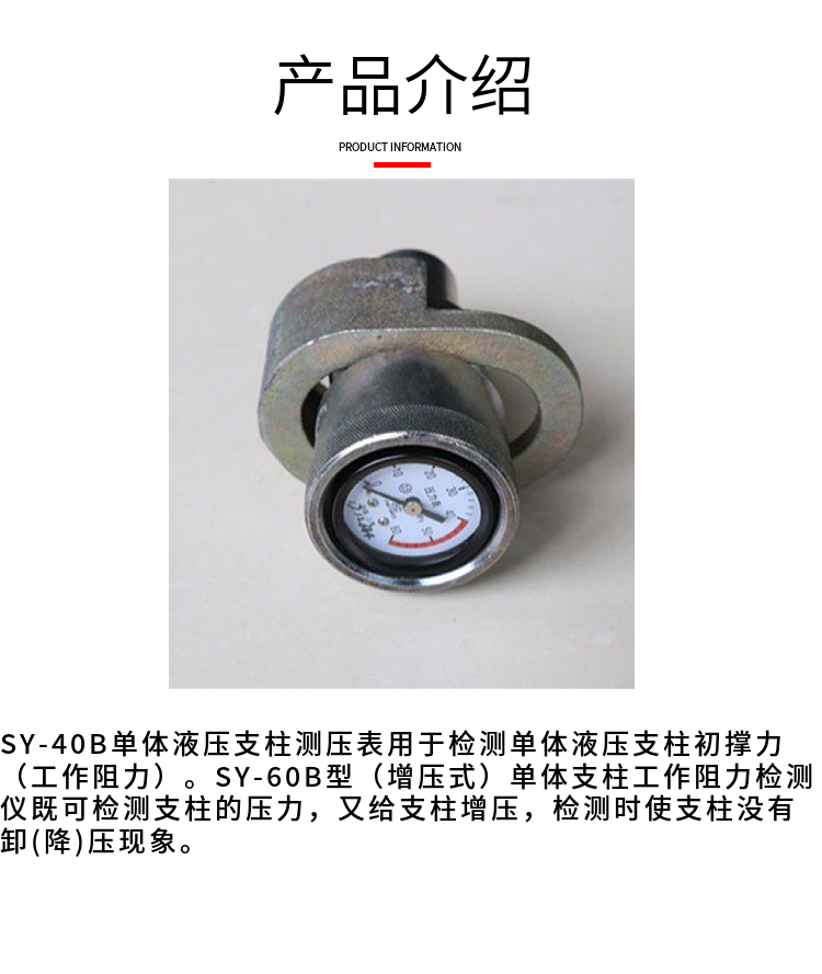 SY-40B单体液压支柱测压表用于检测单体液压支柱初撑力(工作阻力)。SY-60B型(增压式)单体支柱工作阻力检测仪既可检测支柱的压力,又给支柱增压,检测时使支柱没有卸(降)压现象。
