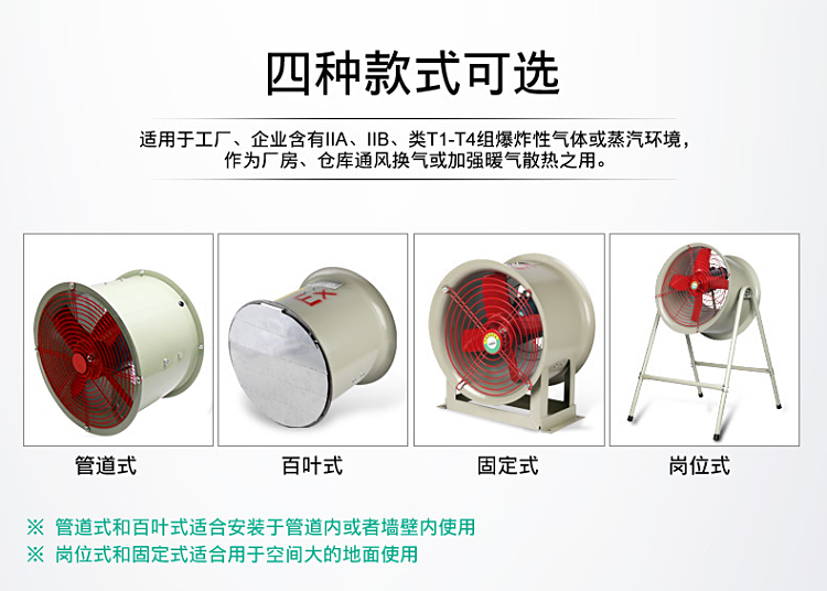 风机按使用要求分管道式,固定式,岗位式三种。为方便储存,也可制成通用结构,固定式配用固定活动脚架,岗位式配用岗位活动脚架。