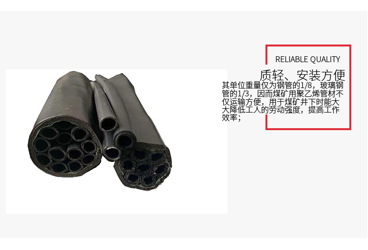 4、PE-ZKW8*2矿用聚乙烯束管耐腐蚀性强:管材具有很强的耐腐蚀性,不需做防腐处理,节省了相关费用,综合经济效益是钢管的5~6倍,特别适用于井下输送高硫水。