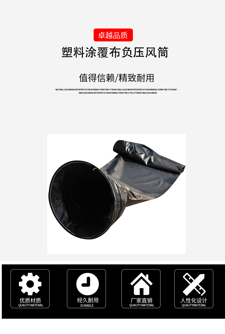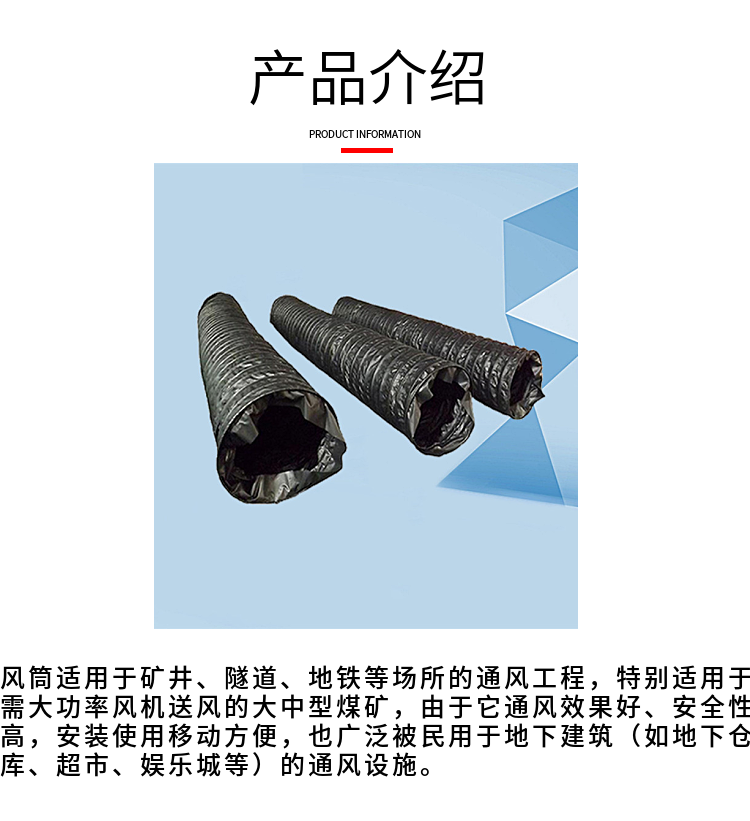 以无缝筒坯加碳素螺旋弹簧钢丝,采用先进的热合工艺制作而成。负压导风筒具有如下特点:抽吸效果好、易转弯、运输贮存方便(能折叠)、使用寿命长等