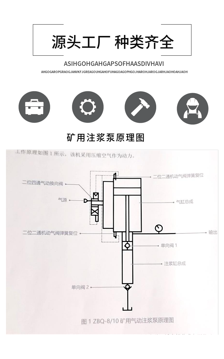ZBQ-8/10矿用气动注浆泵以压缩空气为动力源,由于气缸和注浆缸具有较大的作用面积比,从而以较小的气压便可使注浆缸产生较大的注浆压力。