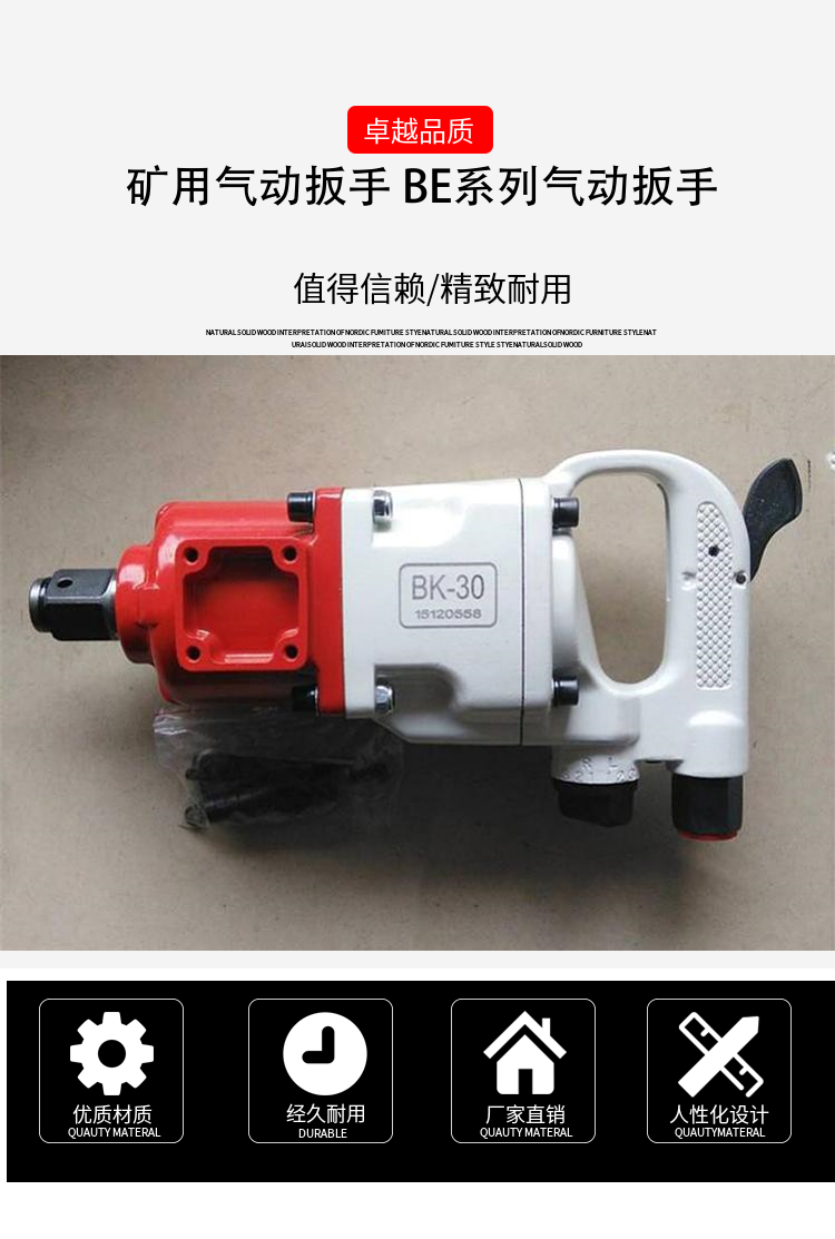 风动扳手具有安全防爆、扭矩大、重量轻、体积小、效率高、结构简单、维修方便等一系列特点。能够满足煤矿井下风压波动大的情况下输出稳定转速的使用要求,可用于U型钢支架和锚杆支架螺母的旋紧和拆卸、树脂锚杆的搅拌以及其他机电设备的螺母装拆,能够提高U型钢支架和锚杆支架的使用性能,保证支护质量。